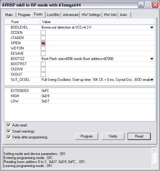 benutze PonyProg, eventuell hilft Dir die Anleitung aus dem "neuen WIKI", da gibt es Beispiele für Avrdude, allerdings kein direktes Beispiel für den AT644 mit den richtigen Fusebits. Siehe :