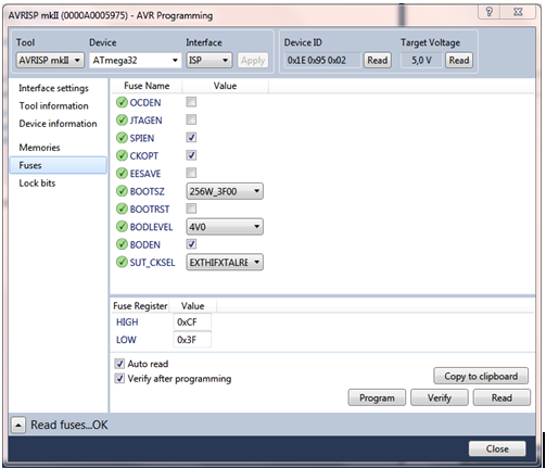 Was bedeuten hier die Fuse-Register? Im Gegensatz zu Deinem (Paul) hat mein High Register 0xCF....