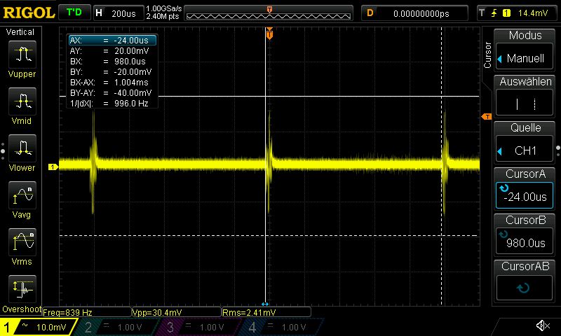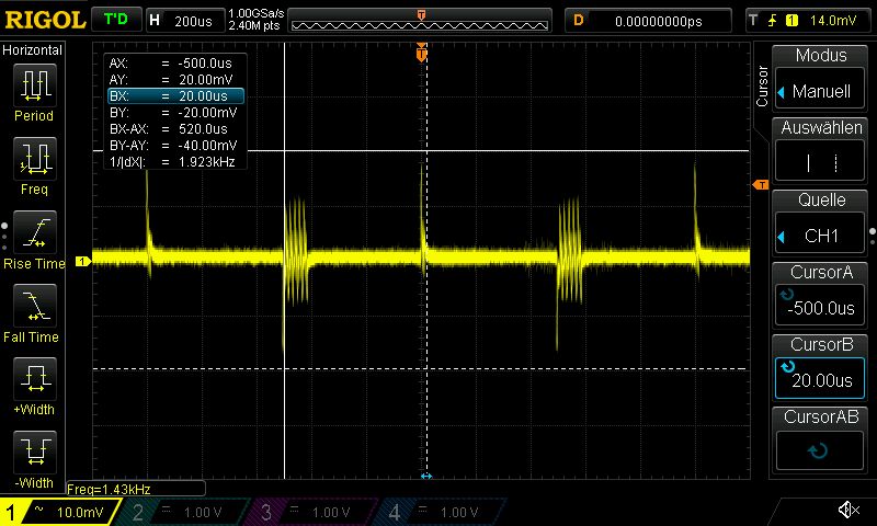 Hier mal kurz ein Bild vom Scope. Das erste Bild zeigt die Spikes der C-Firmware, das zweite die Spikes der Pascal-Firmware.