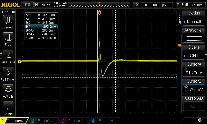 Hier mal das Signal direkt am Ausgang des Multiplexers. Hier konnte ich das Nachschwingen nicht beobachten, bzw. das Scope kommt an seine Grenzen und triggert nur auf ein Signal. Trotz 24M Speichertiefe kann ich nicht bis zum nächsten Impuls scrollen... Das Rigol ist nicht schlecht für den Preis, aber kann nicht alles.