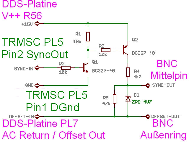 Masse von Kanal 1 und 2, sowie der Außenring der BNC-Buchse sind an OFFSET-IN der Sync-Schaltung angeschlossen.