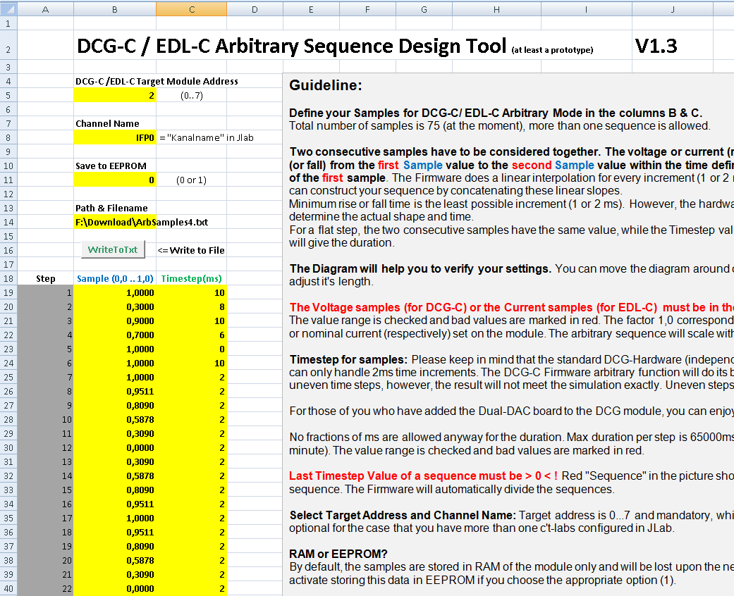 Nachdem ich vor kurzem mein zweites DCG fertig gebaut hatte, habe ich dort die DCG-C Firmware aufgespielt. Bisher bin ich sehr zufrieden damit und wollte heute mal die Arbitrary Funktion etwas anschauen. Da Problem dabei ist, dass ich mit dem Excel Sheet zwar die Textdatei generieren kann, aber JLab diese nicht annimmt.